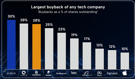 · Aggressive Capital Allocation: The company has demonstrated a robust commitment to shareholder returns, having repurchased 30% of outstanding shares over the last five years. This is particularly powerful given that Prosus’s shares trade at a significant discount to their NAV. This ongoing buyback program provides a significant floor for the share price and can significantly enhance EPS growth.