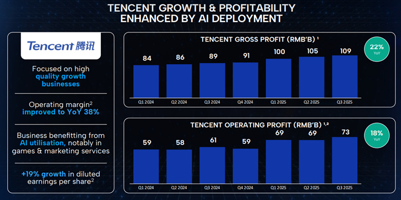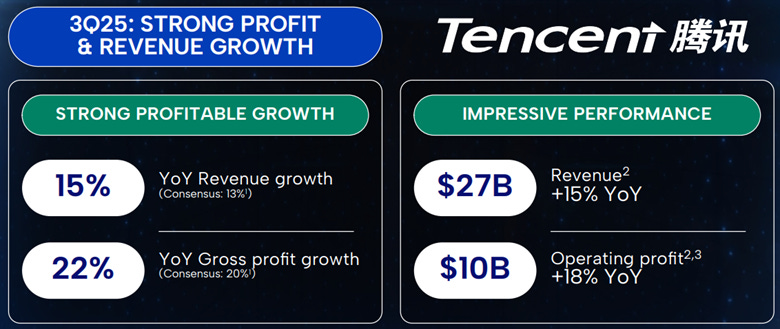 Tencent’s financial performance has remained strong. As of Q3 2025 revenue for the 9 month period was $101.15 billion representing a 13.2% increase YoY. Net income for the same period was $30.21 billion, a 27.8% increase YoY.