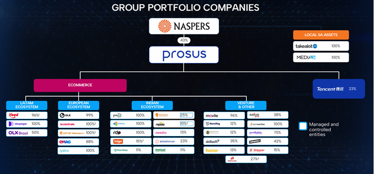 In 2019, Naspers spun off Prosus, listing it on the Amsterdam stock exchange. Prosus houses the groups remaining stake in Tencent (23%) and other international technology assets. Naspers maintains a controlling interest in Prosus (43%), and Fabricio Bloisi serves as the Group CEO for both Naspers and Prosus following his appointment in July 2024.
