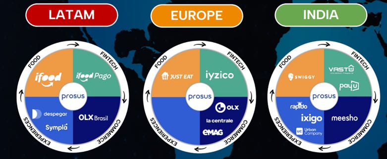 Prosus is bundling it’s subsidiary (and equity investment) companies products and services together into lifestyle ecommerce systems or super app[15] offerings. They are focusing on three key regional ecosystems; Latin America, Europe, and India.